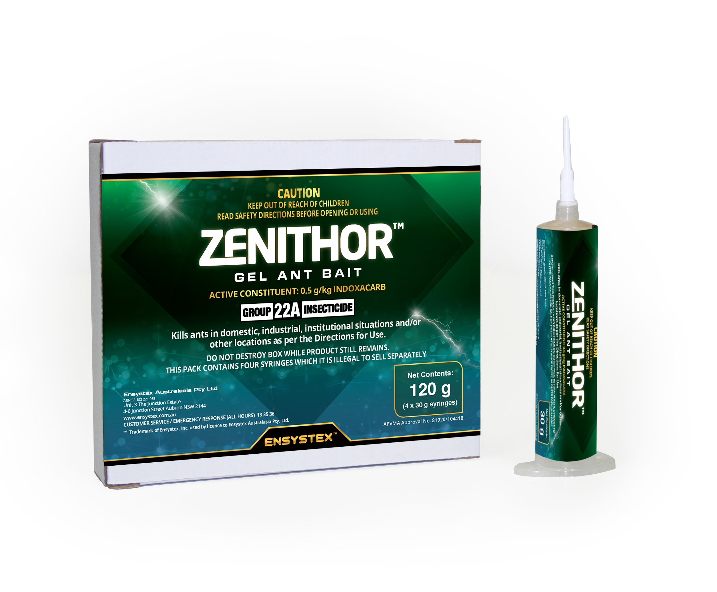 ZENITHOR Gel Ant Bait contains 0.5 g/kg (S)-indoxacarb. Following consumption, ZENITHOR is metabolised into a deadly insect neurotoxin, causing gradual death. This process, referred to as ZENITHOR Enzyme Bio-Aactivation™ adds to both the safety profile of the product and its efficacy. This delay for Bio-Activation to occur ensures the ants return to the nest with the active and the entire colony is eliminated.